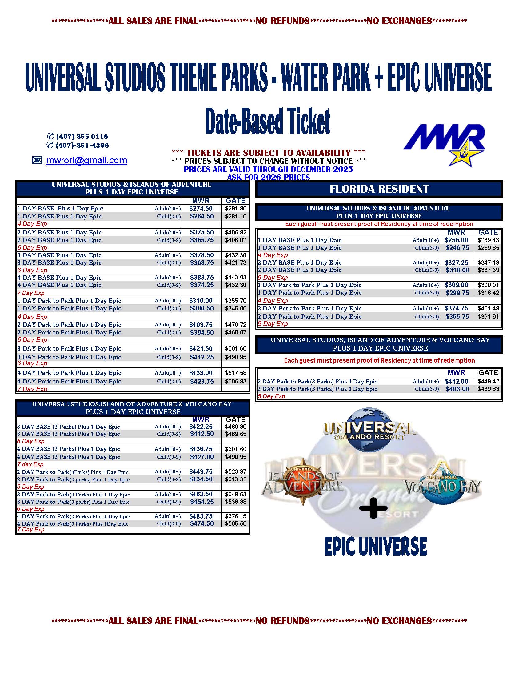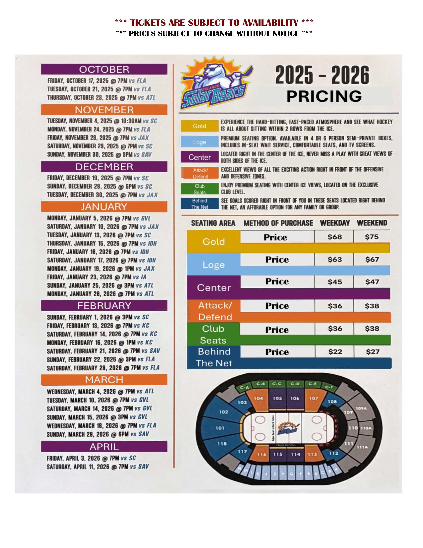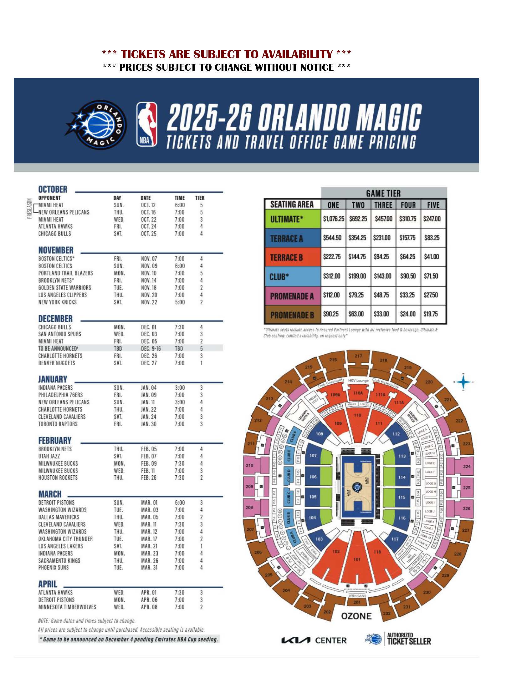 Price sheets and information change frequently. Please click here to e-mail the Tickets and Travel Office directly for a current list of available tickets and prices, download ticket list from this page (bottom right under downloads) or stop by the ticket office.